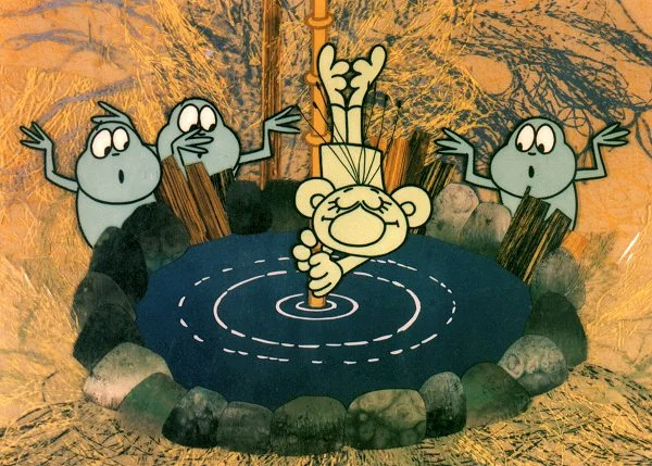Historia z ZSRR o małym niby misiu-niby niewiadomo co, w stylu „postaci o dużych uszach” podobnych do figurek glinianych, wspominanych na początku. Cieszy się dużą popularnością, także poza Rosją. W Japonii jest masa gadżetów związanych z tą postacią, która wpisuje się w standard kawaii.