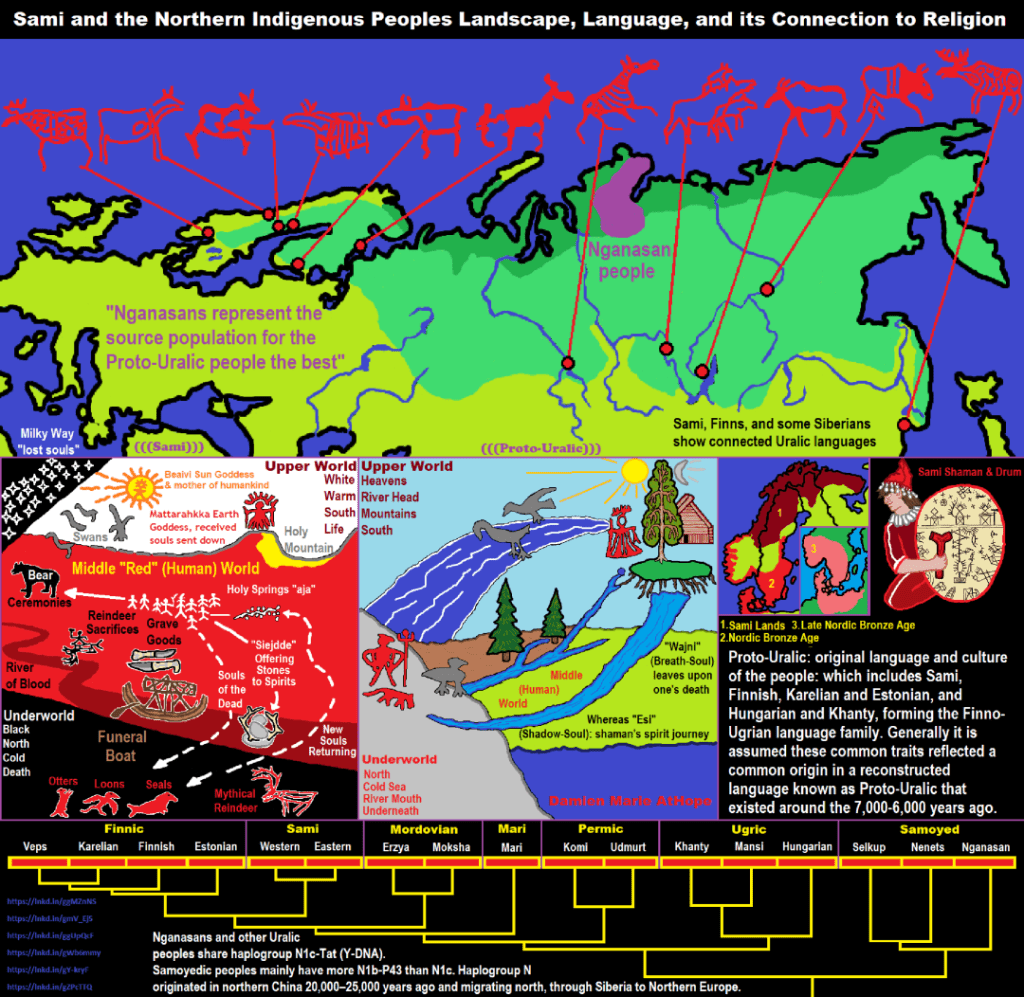 Analogiczny motyw jest obecny w historiach ustnych ludów ałtajskich, gdzie drzewo idzie od sfery ziemskiej do sfery uranicznej, będącej sferę bóstw i zbawionych dusz, a korzenie sięgają krain piekielnych. W obu przypadkach, drzewo stanowi rodzaj „windy” dla dusz, także powracającej na ziemię w postaci demonów[6].