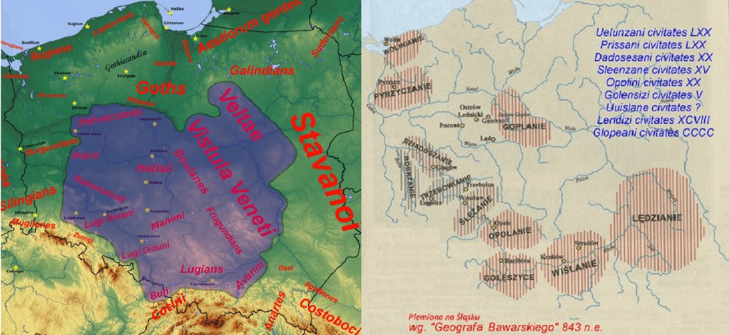 Mapa Tacyta versus Mapa Geografa Bawarskiego. Choć Geograf Bawarski nie odwiedził całej Polski, to jednak można dostrzec podobieństwa nazw ludów regionów, które występują w tym samym miejscu na obu mapach (Sleezane-Silingians, Goes/Gepida-Goplanie, Luigi-Lenduzi). Potwierdzenie tożsamości tych civitas jest jednak możliwe przede wszystkim dzięki testom DNA.