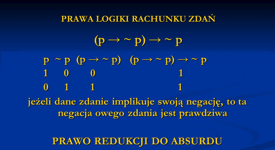 Zgodnie z prawem redukcji do absurdu, jeśli zdanie p pociąga za sobą własne zaprzeczenie, to takie zdanie jest fałszywe. Inaczej mówiąc, twierdzenie fałszywe wyklucza samo siebie.