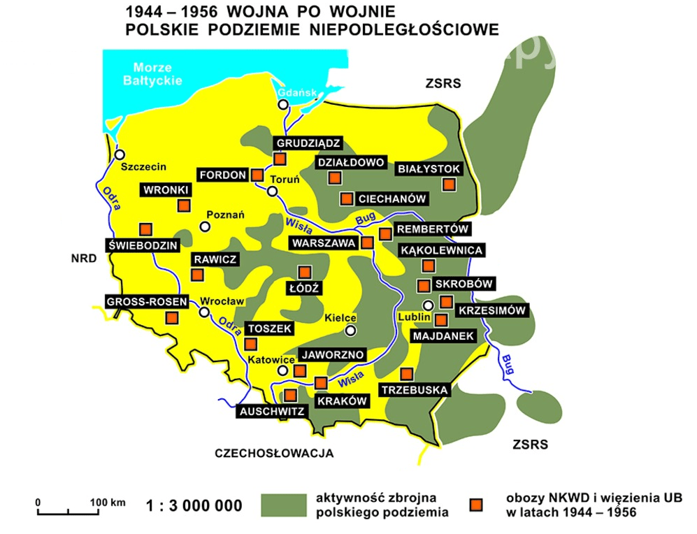 Mapa wojny RP z PRL w okresie do 1956 roku. Z mapę usunąłem dane o przesiedleniach ponieważ wszystkie jakie można znaleźć pochodzą oryginalnie od plakatów propagandowych z 1946 roku i nie mają odzwierciedlenia w wynikach przesiewowych testów DNA mieszkańców ziem odzyskanych jak i kresów. Rząd RP nie uznawał zachodniej granicy co widać bardzo dobrze… potomkowie państwa Bolesława Krzywoustego, mieszkający na tych ziemiach poczuli wówczas, że już nikt ich nie chce… Co ciekawe, na tych ziemiach działał przed długi czas partyzantka nazistowska.