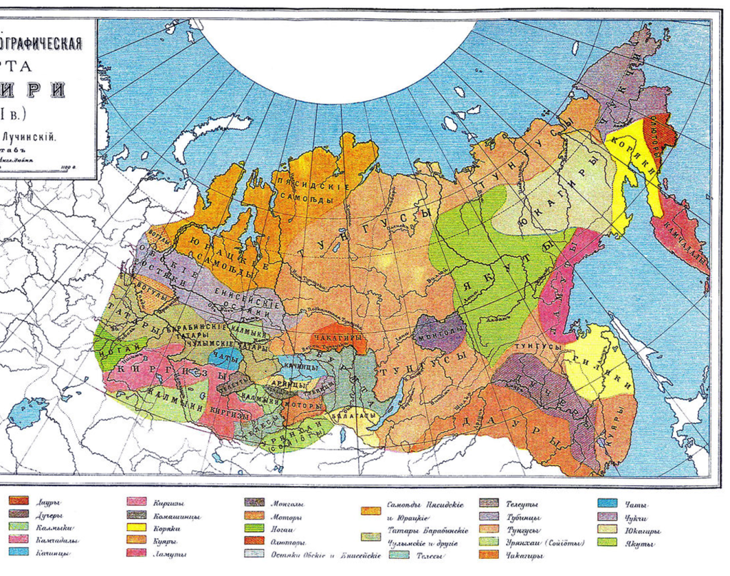 Ponad 30 ludów opisanych przez Rosjan w okolicach XVI wieku. Na mapie nie ma jednak Sachalinu, który wówczas był w granicach Cesarstwa Japonii.