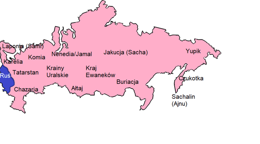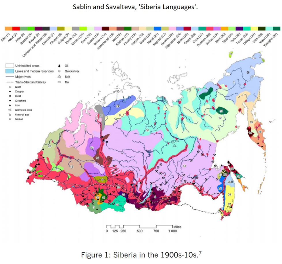 Mapa języków używanych w Carstwie Rosyjskich w roku 1900, na wschód od Uralu. Jest ich ponad 40, a są jeszcze języki używane na Uralu i na zachód od niego (Komi, Neneci). Vyelikaya Roś to kraj wielu narodów, z którego Rosjanie (Rusini Moskiewscy) są tylko jednym z wielu. Z tego powodu należy odróżnić Rosję od Federacji Rosyjskiej.