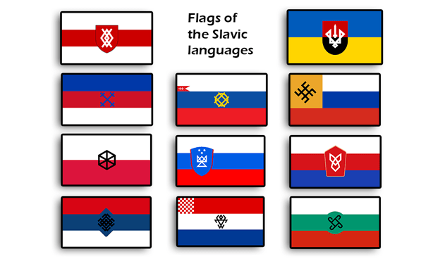 Flagi krajów słowiańskojęzycznych wzbogacone o symbole ludowe, kojarzone z danym krajem
