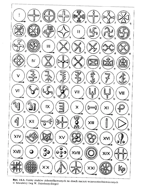 Znaki pogańskie na naczyniach w Kruszwicy. Widać tutaj „krzyż żelazny”. „kołowrót”, „tamgę:” „swastykę” i inne symbole.