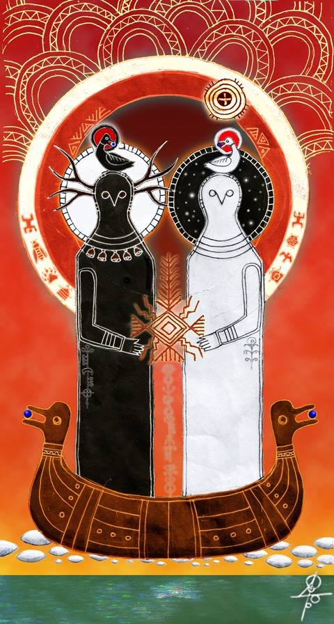 Białobóg i Czarnobóg wzorowani na ryciny gliniane Słowian na ukraińskiej czajce z legendy. Kaczka symbolizuje tego ptaka występującego w jednej z wersji mitu, co ciekawy w tym miejscu jest wielka analogia do motywu stworzenia świata według Ajnów, gdzie zamiast kaczki jest pliszka.