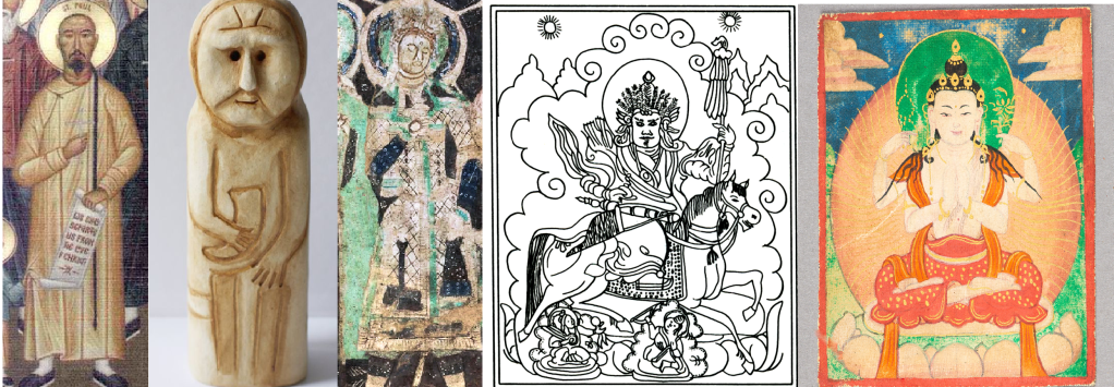 Od lewej: 1. Ikona świętego z aureolą, płaszczem i gestem rąk. 2. Baba Pruska z VII wieku, analogicznado świętych, wraz z gestami rąk i szatą, Mauzry. 3. Malowidła Toharów w prowincji Sinciang, z identycznym układem rąk co u świętych, aureolą i specyficzną szatą, a także pierwowzorem korony w Europie II wiek n.e. granica Chińsko-Kirgisak 4.Wyorbażenie boga nieba Tengi, z aureolą na koniu i buławą, w stylu podobnym do przedstawienia Wandalskiego króla i jego kawalerii, oraz Św. Jerzego, z buławą zamiast włóczni. Małe aniołki Europa przyjęła z Azjii w dużej mierze w baroku, Monoglia. 4. Wizerunek Buddy z aureolą i gestem do modlitwy, Indie/Nepal.